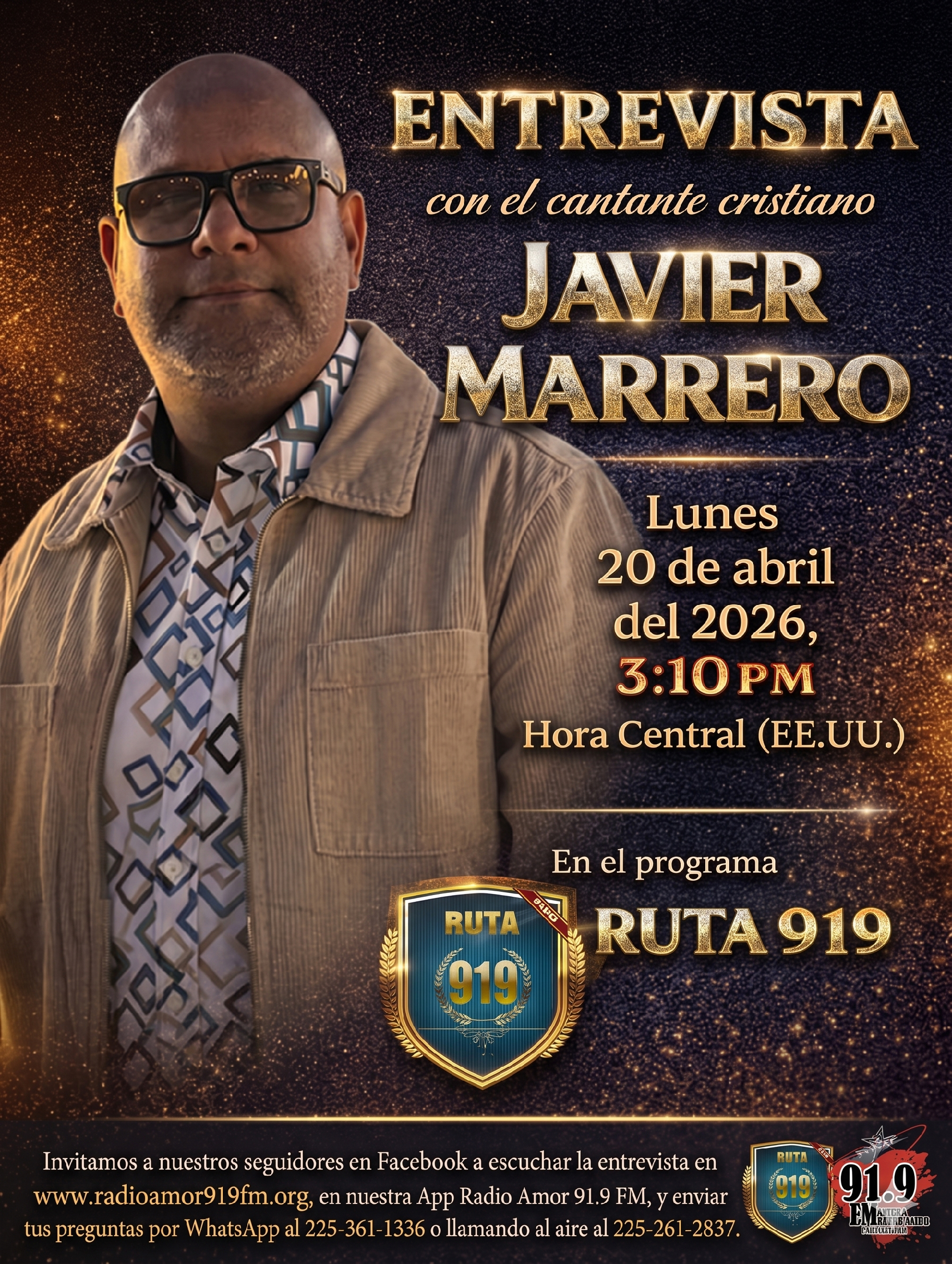 🎙️📅 Lunes 20 de abril de 2026 · ⏰ 3:10 PM (Hora Central, EE. UU.) Acompáñanos en una conversación en vivo con el cantante cristiano Javier Marrero en el programa RUTA 919. Escucha la entrevista por www.radioamor919fm.org y en la APP Radio Amor 91.9 FM. ¿Tienes preguntas para el invitado? Envíalas por WhatsApp al 225‑361‑1336 o llama al aire al 225‑261‑2837. 🎧 No te lo pierdas — te esperamos en Radio Amor 91.9 FM. ❤️